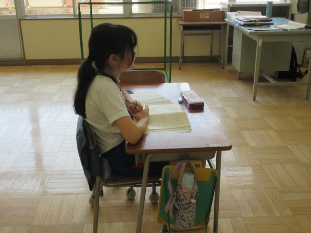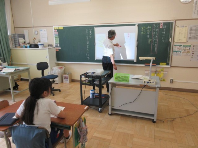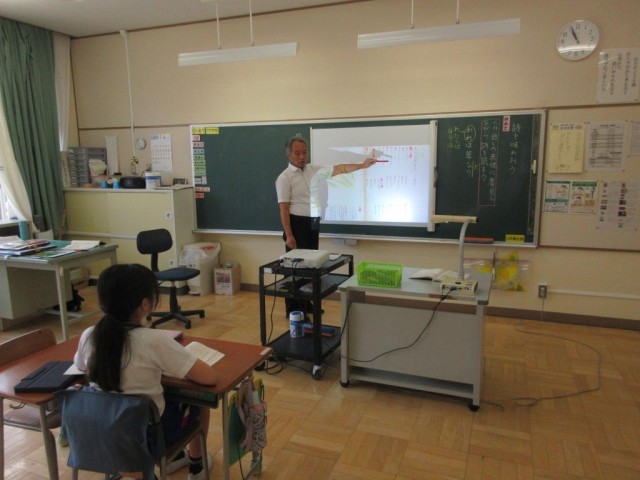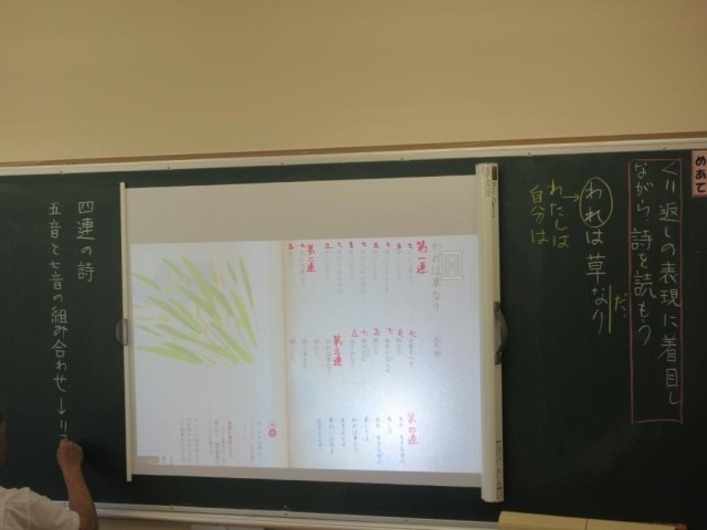 5年生は国語で繰り返しの言葉や、韻を踏んだ様態の詩について学習しています。草野心平の「われは草なり」の詩で、使われている言葉の多くが5音もしくは7音であることを確認し、そのリズムのよさをたしかめていました。また同じ言葉が繰り返し使われていることにも着目し、そのことが詩にどのような効果を与えているかも考えていました。1対1の学習なので児童の様子に合わせて授業が進んでいます。