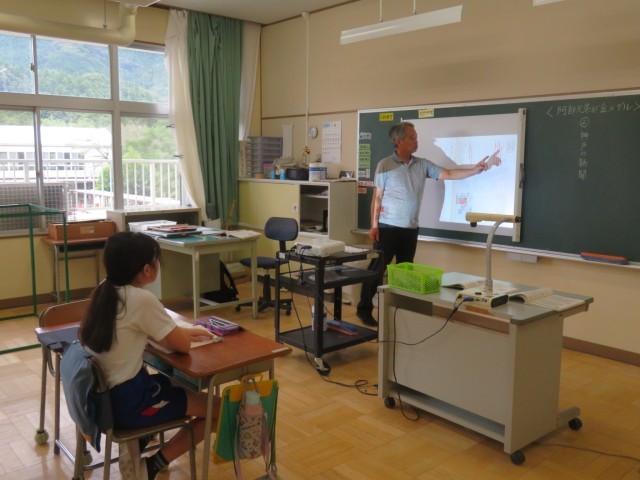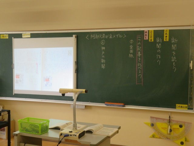 5年生は、国語で新聞について学習しています。今日は、「阿部兄弟が金メダル」という同じ出来事に関する全国紙と地方紙の記事を読み比べ、その違いを確認していました。違っている部分に線を引きながら2つの記事を読み比べるうちに、読む人(全国の人か阿部兄弟の地元の人か)に向けて、記事に書かれる内容が違ってくることに気がついていました。