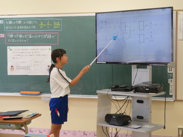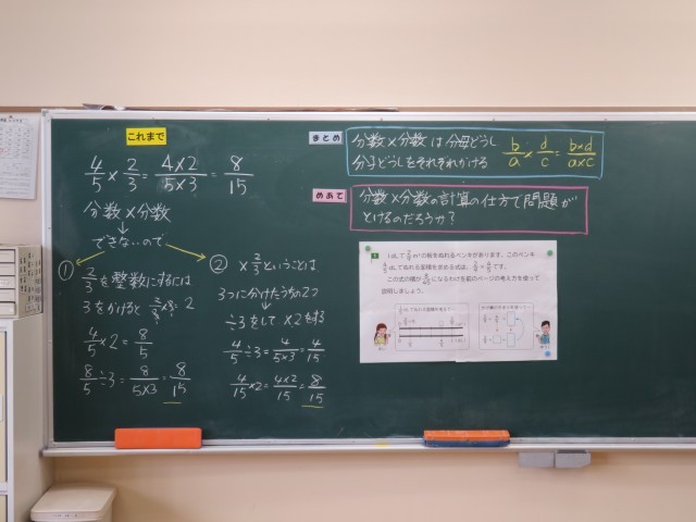 6年生は、分数のかけ算について学習しています。今日は、9分の2×5分の4の積が45分の8になる訳を真剣に考えていました。前時までに学習した内容をもとに、まずは、各自で考え、その後、お互いの考えを共有していました。6年生の様子を見ていて、「分数×分数は分母同士、分子同士をかけて答えを求める」とただ覚えるのではなく、なぜそうなるのかをきちんと考え、理解することが、納得感や算数を学ぶ楽しさにつながるのだと感じました。