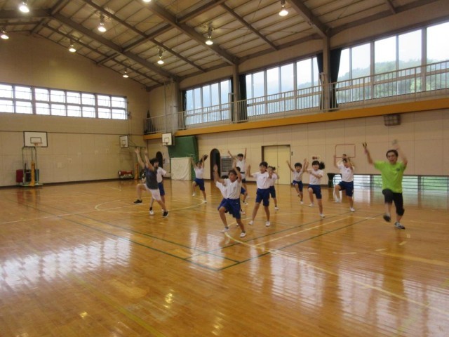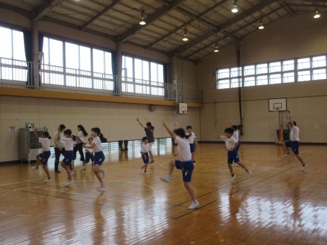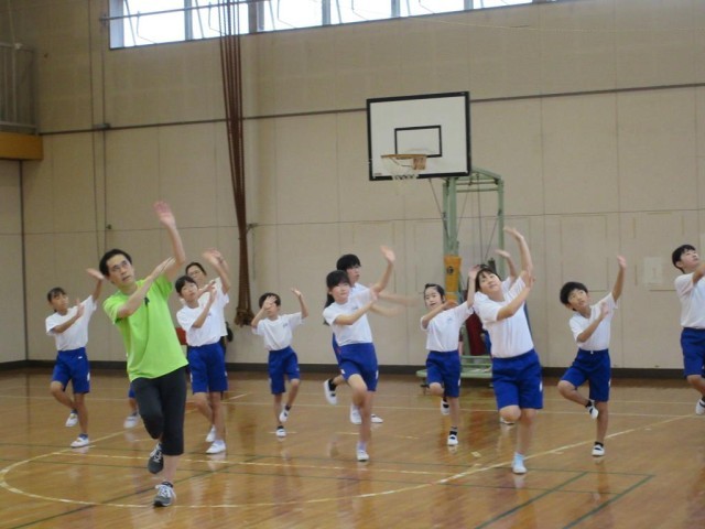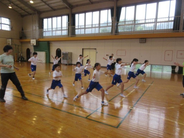 業前から引き続いて体育館で運動会の表現運動の練習をしました。今年の表現運動は「藤岡音頭・ダンス藤岡」です。藤岡音頭のゆったりした動きと、ダンス藤岡のはねるような動きを表現します。今日は「ダンス藤岡」の練習に入りました。最初に先生から見本の動きを見せてもらい、その後全体で練習をしました。高学年の子はダンスが好きな子が多く、細かいところに自分で気づいて修正しながら動いていました。その様子を低学年の子が真似しながらついていっている様子です。子どもたちの「やる気」を見ていると、運動会がとても楽しみになりました。
