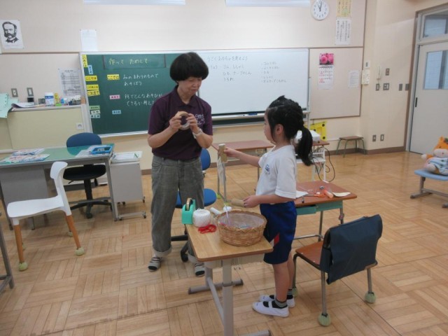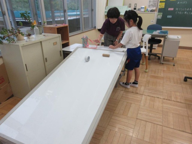 2年生は生活科で「うごくおもちゃをつくろう」を学習中です。今までの経験から、動かして遊べるものを考えてつくり、先生と試していました。坂を作って転がして遊ぶおもちゃを、トイレットペーパーの芯の中に乾電池を入れて重くし、早く転がるものをつくって楽しんでいました。他にもカップを使ったけん玉など楽しいものをたくさんつくっていました。今日は雨降りで外に出られないので、休み時間つくったものを使って遊べます。今までの経験や、創意工夫で楽しい遊び道具をつくることができました。