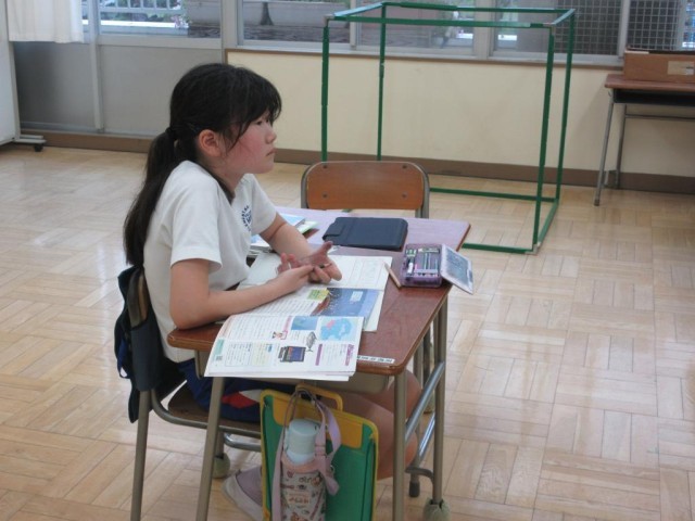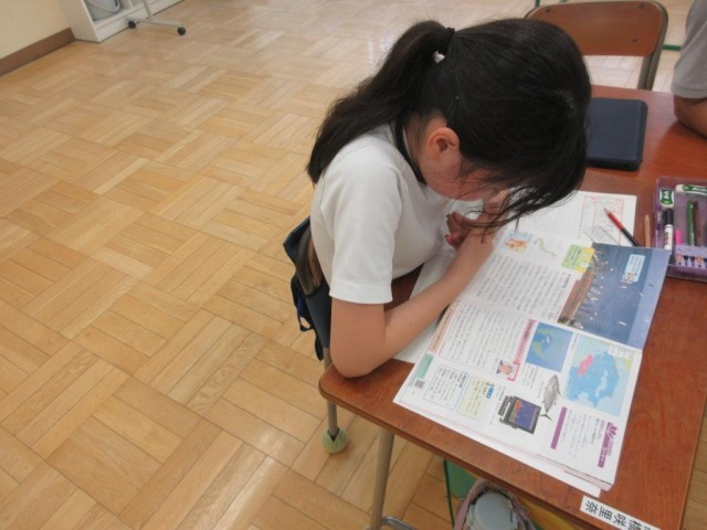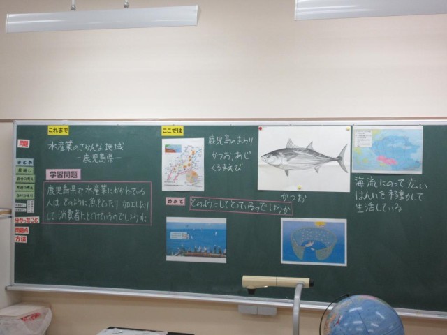 5年生は社会科で日本の水産業について学習しています。今日は、鰹漁を題材に、漁師の方がどんなふうに魚を捕まえているかを調べています。先生が用意した鰹の原寸大のイラストに興味津々の様子で調べ始め、一本釣りや巻き網漁など熱心に調べていました。