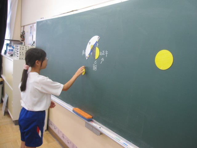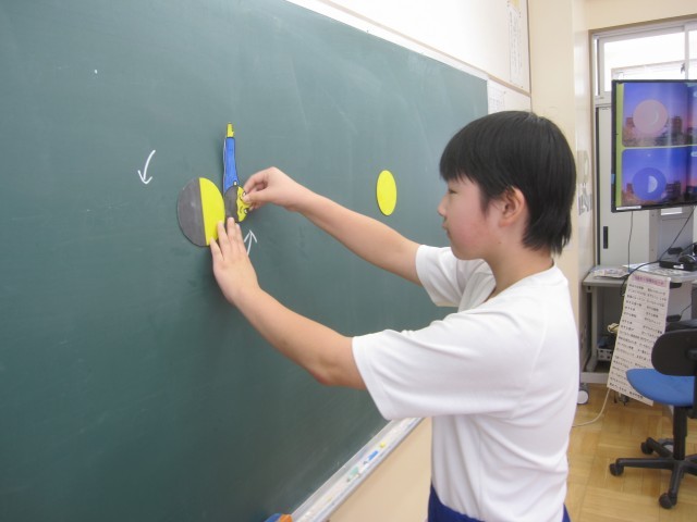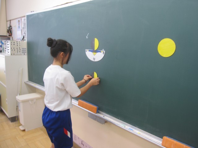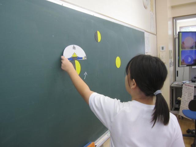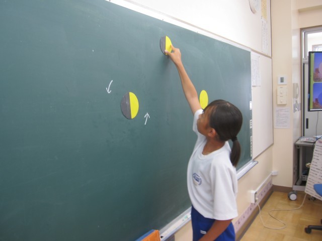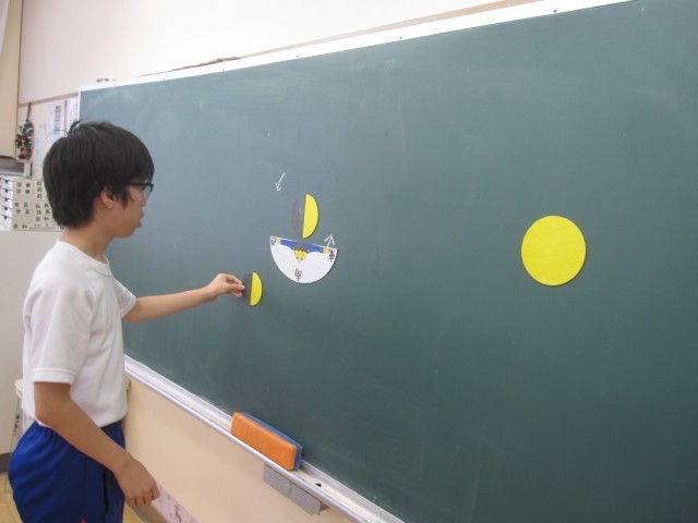 いつどちらの方位にどんな形の月が見えるのか、模型を使ったり作図したりして考えました。