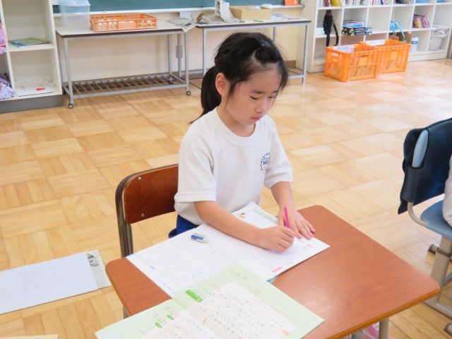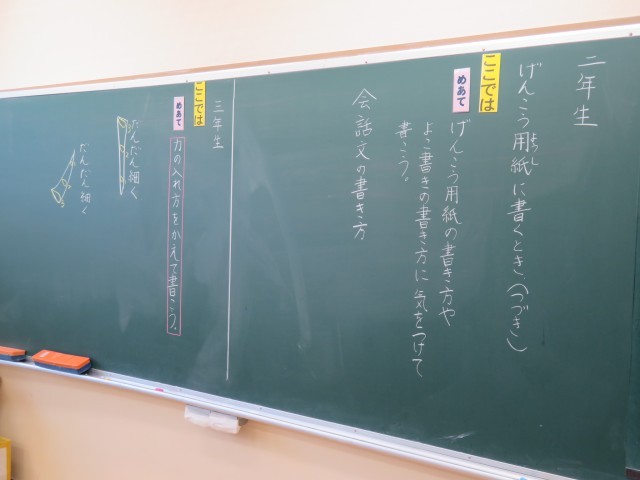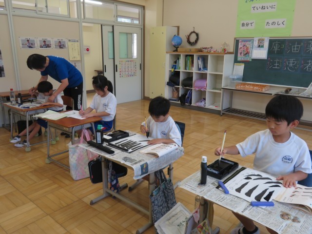 2・3年生は、書写の学習に取り組んでいました。2年生は、原稿用紙の書き方や横書きの書き方に気をつけながら、鉛筆で丁寧に文字を書いていました。とてもよい姿勢で文字を書いていて感心しました。3年生は、力の入れ方に気をつけながら、毛筆で「はらい」の部分を練習していました。先生の「3・2・1と力の入れ具合を変えて書くとよいですよ」という助言を守りながら、一生懸命練習していました。「はらい」を上手に書くのは難しいですが、繰り返し練習して上手に書けるようになりましょう。