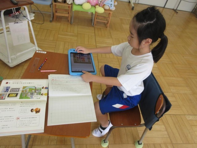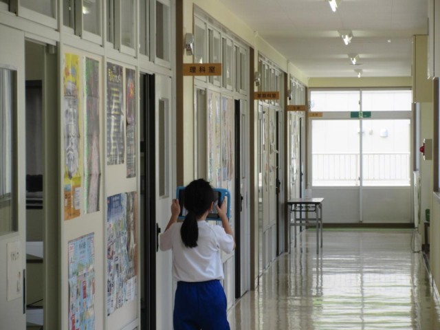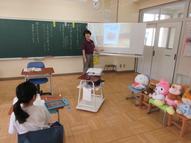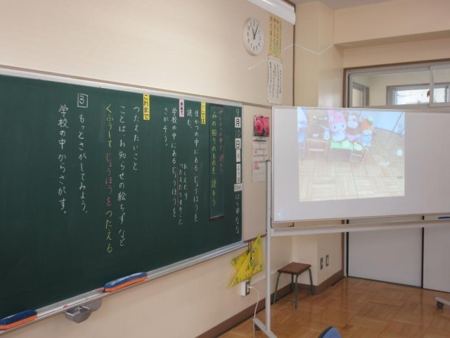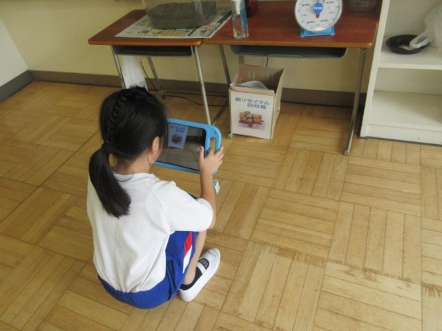 2年生は「情報を伝える」にはどんな工夫があるかを学習中です。今日は身の回りにある情報にはどんなものがあるかを考えています。先生から、見つけた情報を写真に撮ってみよう、と投げかけられ、教室の後ろにある「紙リサイクル回収ボックス」を見つけて写真を撮っていました。教室から一歩広げて校舎内で探していると、教室を示す木の掲示板を見つけパシャリ、身の回りには実はたくさんの情報があふれていて、様々な工夫をしていること、自分でも実際に情報を発信できるるよう学習を進めます。
