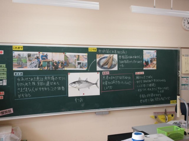 5年生は社会科で日本の水産業の学習に取り組んでいます。魚の加工品「かつおぶし」のことを調べています。かつおぶしの作り方を調べたり、その歴史を調べたりしました。また動画であらためて確認しました。