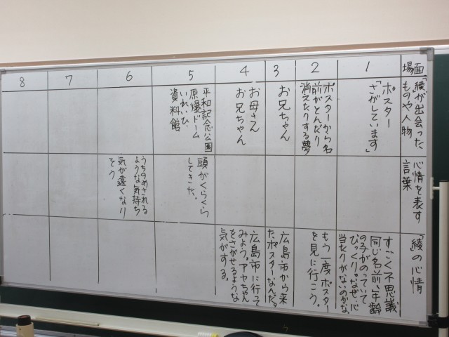 5年生は国語の学習で、広島の原爆について書かれた説明文の読解を進めています。1発の爆弾で多くの人が亡くなったこと読み取りとても驚いていました。先生との対話の中で、場面ごとに、伝えていることなどをまとめていました。