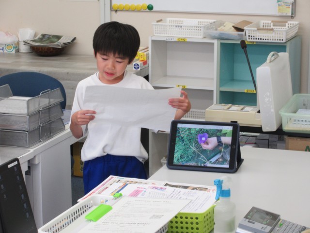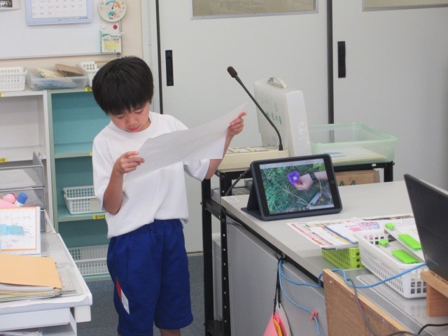 みかぼ学級では、3年生が発見したものを紹介する学習をしています。体育館の裏側できれいに咲いているアサガオをみつけ触ってみた感想などを、職員室で画像と共に発表してくれました。自分の考えや感想をきちんと発表することができ、学習の成果が表れていました。