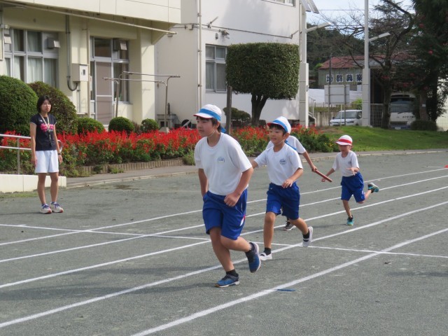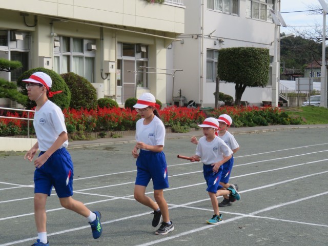 今日の業前は、全校で全員リレーの練習をしました。最初に、団ごとにバトンパスの練習をしました。一列に並んで走りながらバトンを渡す練習をしたり、バトンゾーンの中のどこでバトンを受け取るのかを確認したりと、自分たちで工夫しながら練習していました。その後、入場から競技、退場までの一連の流れをやってみました。いよいよ、今週末が運動会。どちらの団も最大限の力を発揮できるよう、協力して頑張ってもらいたいです。