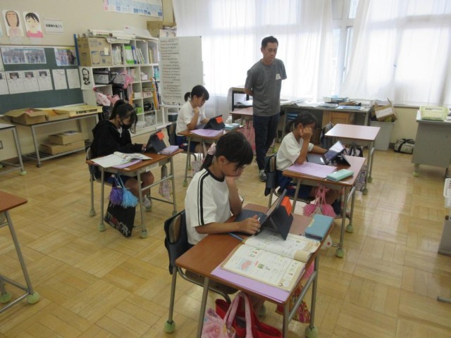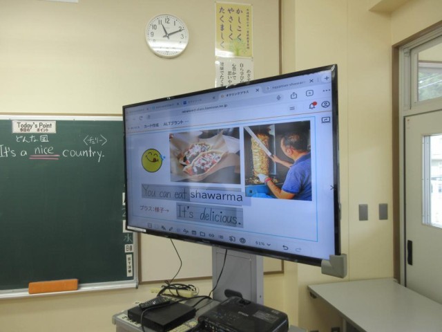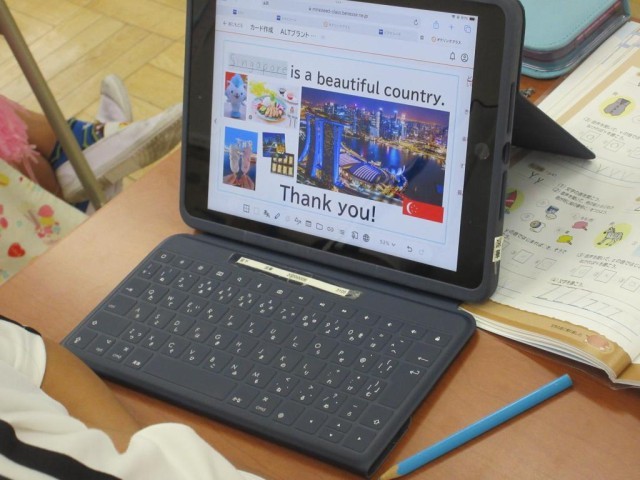 今日は週に1回のALTの先生が来てくれる日です。6年生は行ってみたい国について、英語でスピーチするための資料づくりに取り組んでいます。オクリンクプラスで発表する予定です。
