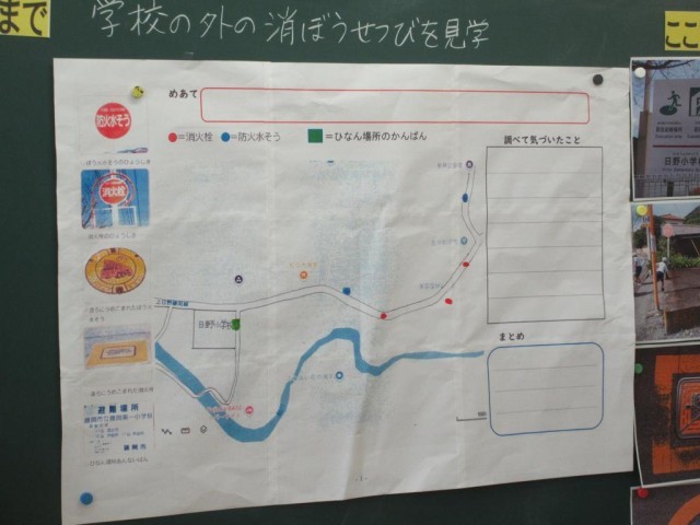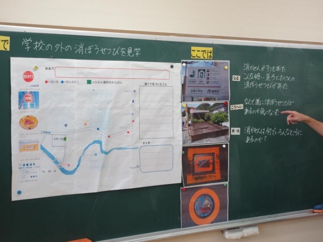 3年生は社会科で自分たちのくらしを守る仕組み作りについて、特に消防のことを調べています。前回学校周辺の防火用水や消火栓がどんなところにあるかを実際に歩いてたしかめ、地図に落とし込んでいきました。今日はそれをもとに話し合い活動をしています。「どうして道路沿いに消火栓や防火用水があるのか」「郵便局の近くにあるのは何か理由があるのか」など自分たちが疑問に思ったことを出し合っていました。