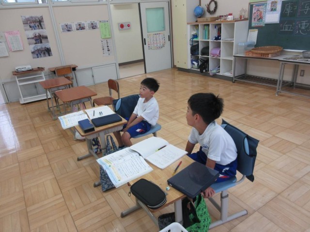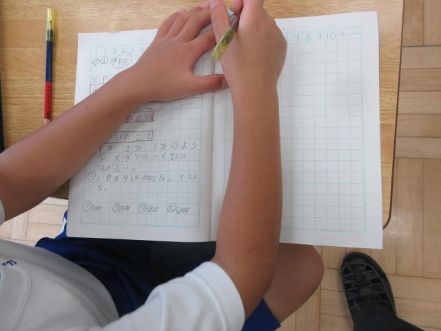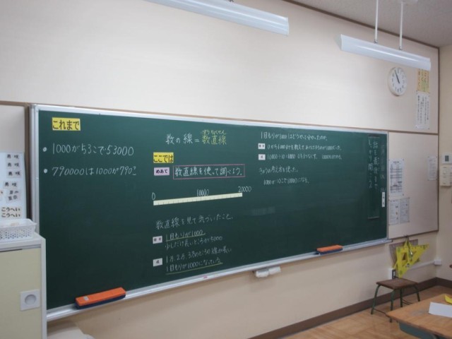 3年生は算数で、数直線を使った大きな数の学習をしています。10個の目盛りが10000の数直線から、「一目盛りはいくつだろうか」という問いがあり、子どもたちがそれぞれ考えを述べる中で、お互いに考えを聞いた後、「半分くらいわかった」ということになり、さらに会話しながら説明を続けていました。子どもたちが対話の中から考える学習ができていました。