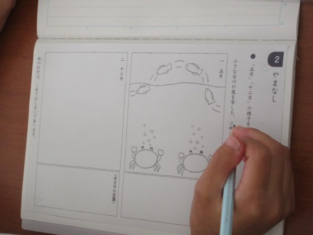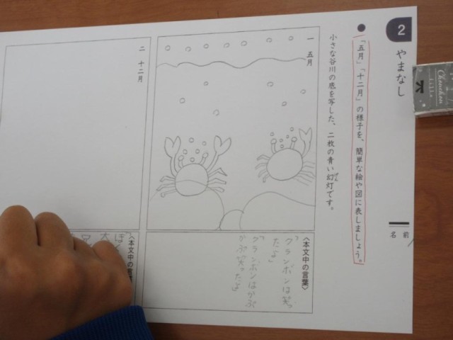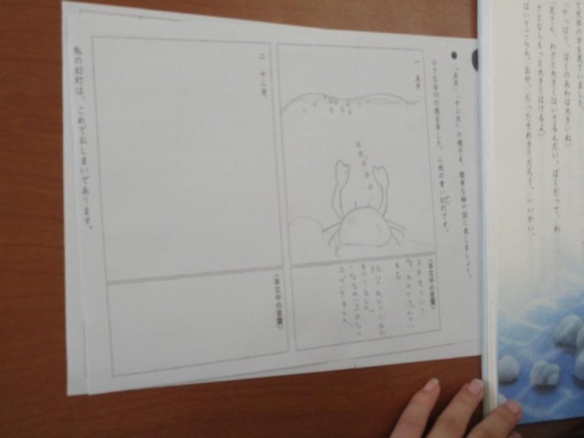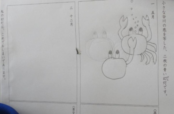 6年生は、国語で宮沢賢治「やまなし」の内容を、イメージ図で表そうとしています。川底の風景を文章からどのようにとらえるかの学習です。それぞれが文章から感じ取ったイメージを簡易な図で表しています。