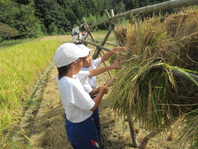 今日の5校時は、地域の農家の方のご協力を得て、春先に植えた稲の苗を刈り取る「稲刈り」をさせていただきました。2年生から6年生までの全員が、まさに「せっせ」と稲を刈って束ね、わらで縛って木で組んだ台に干しました。初めての経験の子もいるので心配でしたがあっという間に慣れていき、時間内に予定していた稲を刈り取ることができました。5年生の女子児童が代表して、「大変な思いをして育てたお米をこれからはもっと大切にしたい」とお礼の言葉を述べていました。帰りがけにはお土産までいただいて、充実感いっぱいの学習となりました。ふらっと農園の皆様、ありがとうございました。5年生はこの後、今までの様子をまとめたり、出来上がった精米を調理していただく学習をしていきます。