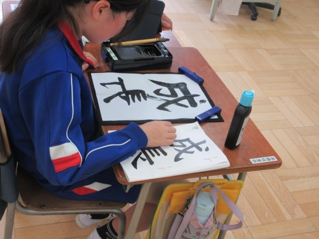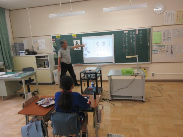 5年生は書写で、筆順によって画の始筆同士が付くとき、先に書いた画が出る字を書こうとしています。最初に先生から説明を受けて、その後タブレットの動画を見て書き方を確認しました。その後まずは自分で一回書いてみて、先生といっしょによかったところなどをアドバイスされていました。