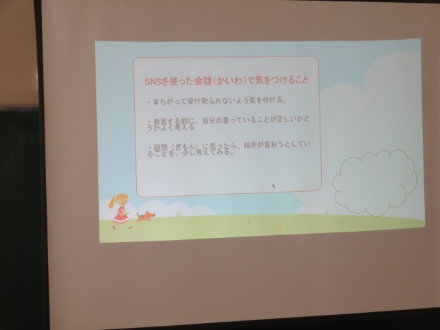 今月の朝礼は前回に引き続き、メディアリテラシーのお話をしました。先日行われた多野藤岡いじめ防止フォーラムで藤岡北高校のPTA会長さんが「SNSの表現でおこる誤解(トラブル)」に関わったことをあいさつでお話しになったことにふれ、具体的な事例を紹介しながら話を進めました。最後は、大事なことは「落ち着いて考える」「疑問に思ったことはきちんと口に出して会話の中から誤解を解く」「普段のコミュニケーションを大切にすることが大事」というまとめをしました。西一貫校校区では、メディアリテラシーを指導の重点項目としています。引き続きメディアリテラシーに係る指導を続けていきます。
