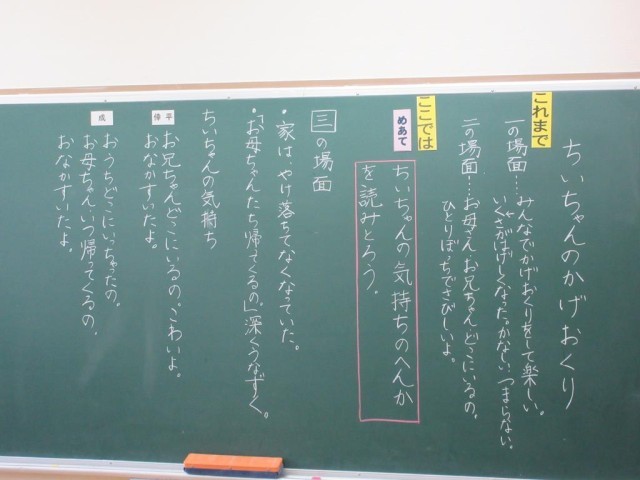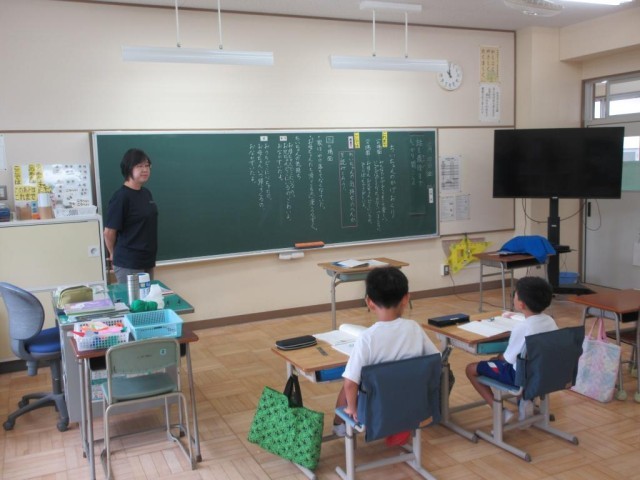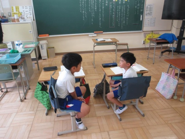 3年生は国語で「ちいちゃんのかげおくり」という戦争にまつわる物語文の読解を進めています。今日は空襲で家族とはぐれてひとりぼっちになってしまったちいちゃんの心情を読み取っています。2人とも「さみしい・こわい」という思いをしていると答えたのですが「何が怖いんだろう」という先生の補助発問から、話し合いが始まりました。2人しかいないので常に2人で考えを出し合いながら学習を進めています。