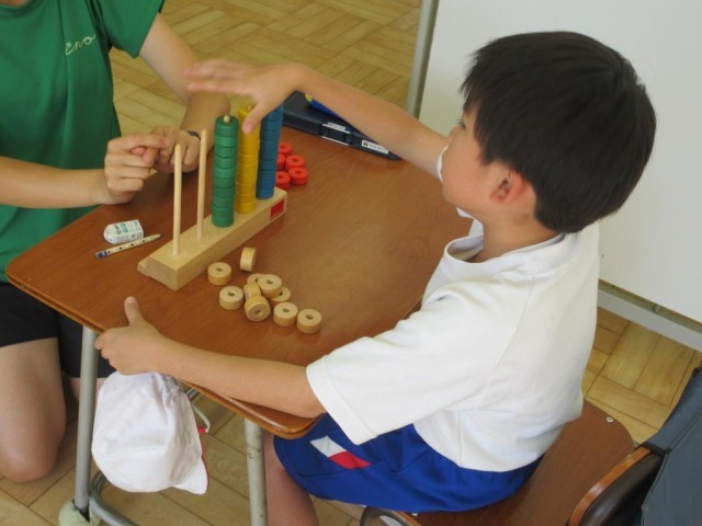 みかぼ学級では、3年生が指先の運動で小さなわっか様の部品を指していく訓練をしています。一つ一つの動きをじっくり丁寧に進めていました。6年生は小数の計算の復習です。