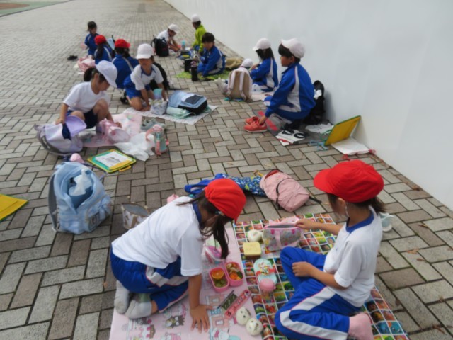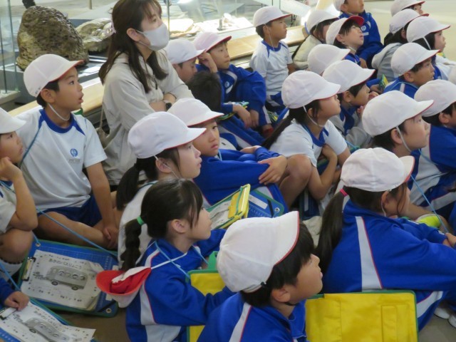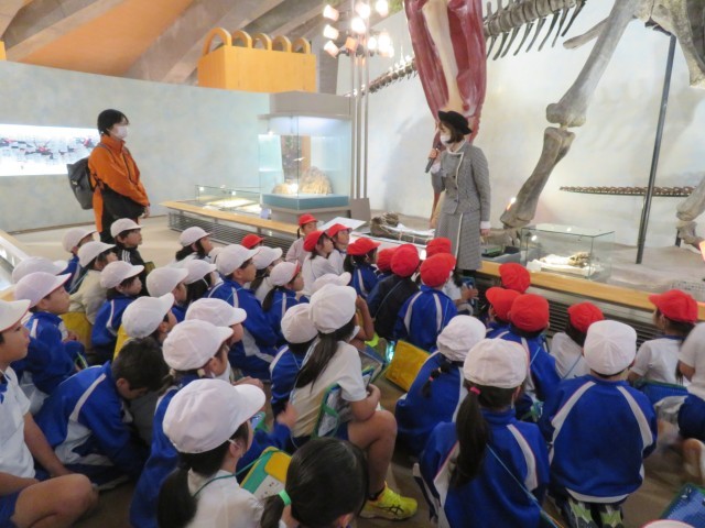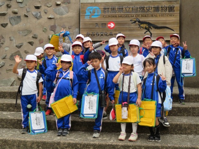 群馬サファリパークを出た後は、群馬県立自然史博物館に向かいました。到着後、まず、班ごとにお弁当を食べました。おうちの方が作ってくれたお弁当うれしそうに見せてくれました。お昼の後は、自然史博物館の前で記念撮影。その後、館内に入り、全員で恐竜「カマラサウルス」に関する話を聞きました。ほとんどが本物の骨で作られたカマラサウルスの骨格標本は世界に七つしかないそうで、貴重な話をみんな真剣な表情で聞いていました。