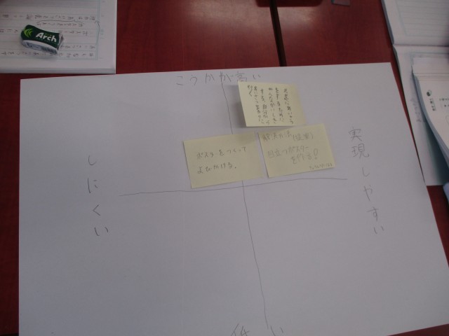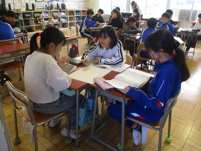 先週の金曜日から、5年生は「よりよい学校生活をおくるために」という単元で、平井小学校の5年生と一緒に話合い活動について学んできました。今日は、各班ごとの議題に基づき、実際に話合いを行いました。本校5年生は3人で「挨拶の声を大きくするにはどうしたらよいか」というテーマで話合いました。各自が自分の意見とその理由を出し合ったり、互いに質問したり、その意見を「実現しやすいかどうか」「効果が高いかどうか」という視点で分けたりしながら、班としての考えをまとめました。明日は、各班が話し合いの結果を発表し、共有します。よりよい学校生活を送るために、どんな課題解決の方法がでるのか、今から楽しみです。