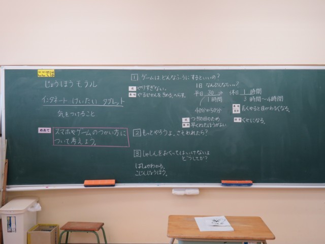 2・3年生は道徳の時間で、スマホやゲームの使い方について考えていました。ゲームをどんなふうにするとよいかや、1日何分までならよいのかなどについて、自分の体験を基にそれぞれが意見を出していました。大きくなるにつれ、特にスマホと関わる機会は増えると思います。だからこそ、小学生のときから「情報社会で適正な活動を行うための基になる考え方と態度」を身につける教育(情報モラル教育)が必要になってきます。今日の授業は、子どもたちが自分自身を振り返り、今後どうしたらよいかを考える、とてもよい機会でした。