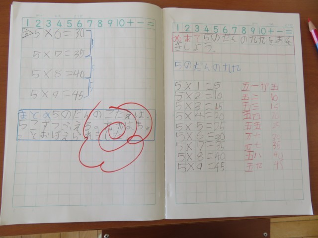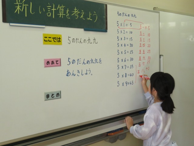 2年生は、「5の段の九九を暗記しよう」とめあてで学習に取り組んでいました。「五一が5」「五二 10」「五三 15」・・・とノートに書いたり、タブレットで繰り返し練習したりしました。「五一が5」などとノートに書く際には、「五」が「1つ分」、「一」が「いくつ分」だから「5(全部の数)」になるというふうに、これまでの学習を振り返りながら書いていました。2の段に続き、5の段も暗記できるよう、繰り返し声に出して頑張ってほしいです。暗記できたら聞かせてね!