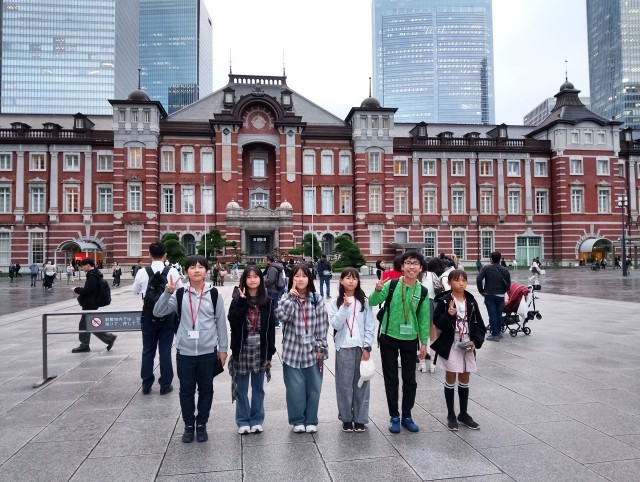 東京駅に到着しました。赤レンガの駅舎前で記念撮影。この後新幹線に乗ります!