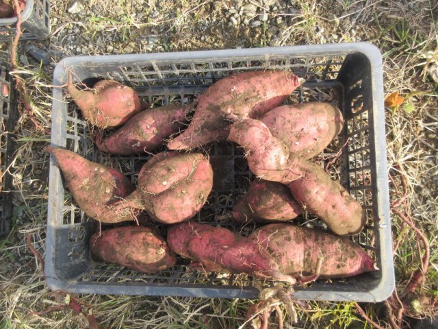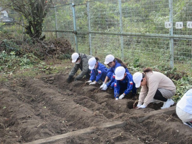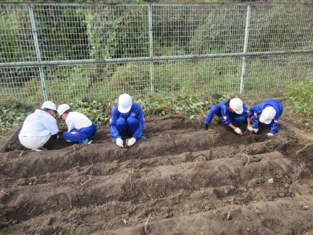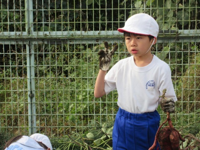 今日の業前は、自分たちで育てていたサツマイモの収穫です。事前に業務員さんに蔓を切っておいてもらい、慎重に芋のまわりを掘り進めまました。団別に、6年生が下級生の面倒を見ながら一緒に掘っている姿に感心しました。大きな芋がとれたときは歓声が上がり、芋が切れてしまったときは残念がるなど一喜一憂の活動でした。がんばったかいがあってたくさんの芋がとれました。この芋は、11月13日の学校公開日の日に、保護者の方や地域の方と一緒に焼き芋にして試食する予定です。