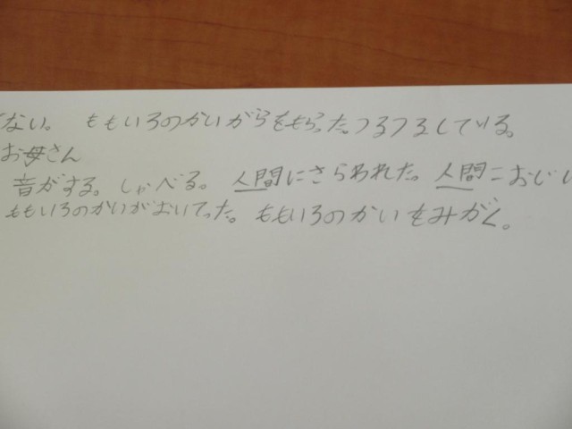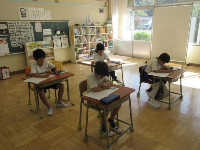 23年生の子どもたちは、図工で、物語の内容を絵に表す学習に取り組んでいます。「あいたくてたまらない」という物語を先生が読み上げていて、子どもたちは熱心にメモを取っています。どんな登場人物がいたか、どんなお話しだったか、印象に残っている場面はどこか、どんな絵が思い浮かぶかなど、想像をふくらませながら話を聞いています。この後、想像を絵に表していきます。