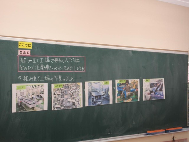 5年生は社会科で自動車工業の学習を進めています。今日は、自動車がどのように組み上がっていくのかを、写真を並べ替えながらまとめています。春のSUBARU工場見学のことを思い出しながら、学習を進めています。