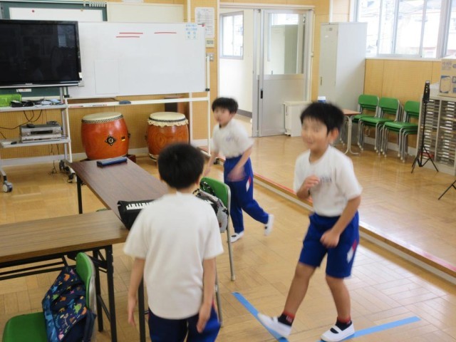 2・3年生は音楽の授業です。授業のはじめには、体でリズムを取る「ウンパッパ」や朝の学活で練習している「気球に乗ってどこまでも」を歌って、音楽の学習に入る準備をします。子どもたちが気持ちよく歌っている様子をみて、見ている方もリズムに乗ってしまい、一緒に歌ってしまいました。ニコニコしながら歌っている様子を見て、とてもうれしくなりました。