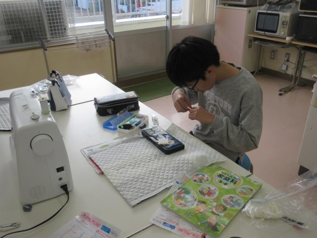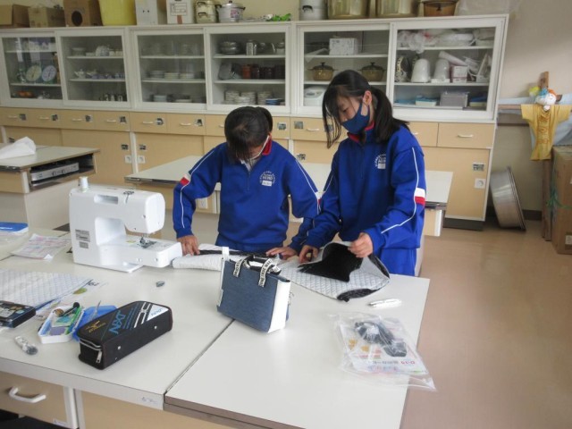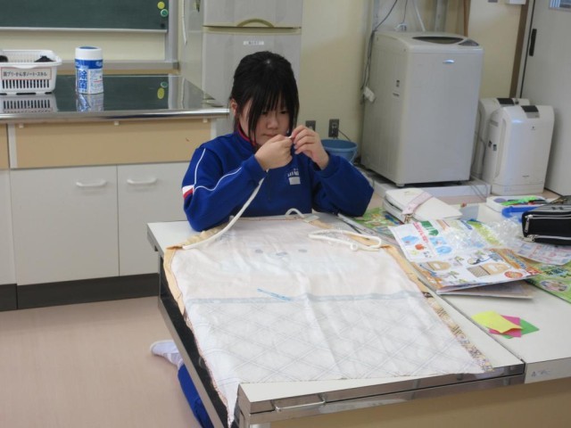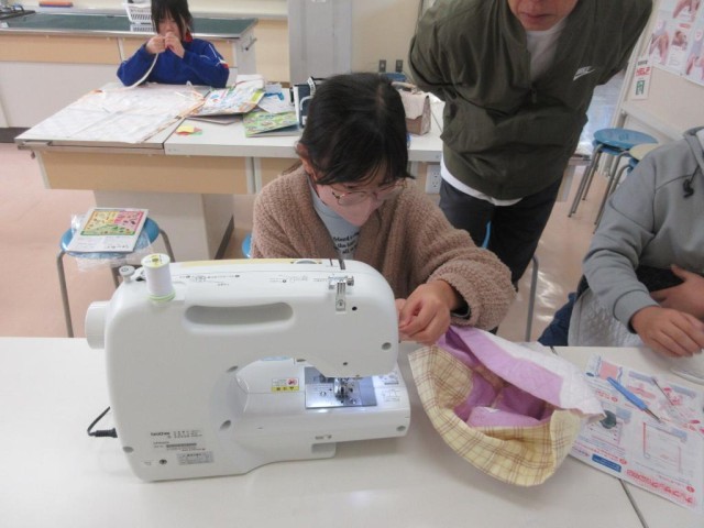 56年生は家庭科で、5年生がエプロン、6年生がナップザックをつくっています。6年生はミシンの扱いもうまくなり、どんどんミシン縫いにチャレンジしています。5年生は手縫いでエプロンをつくっていて、もう仕上げの段階です。このエプロンをつけて調理実習をすることになります。