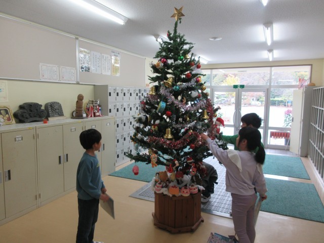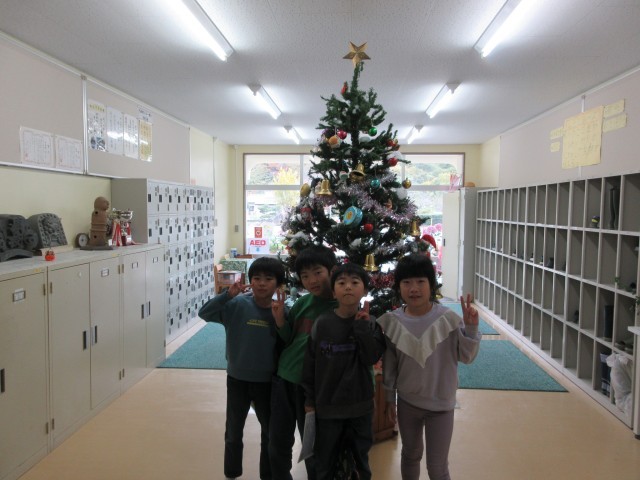本日ウィズの方2名が来校し、ウィズで使っていたクリスマスツリー1体を設置しに来てくれました。今年度いっぱいで平井小と統合する日野小の子どもたちが少しでも喜んでくれればと、学校運営協議会の委員でもある地域の方のお計らいで、設置していただくことになりました。ツリーを見た子どもたちは「すげー」とまわりをぐるりと見渡しながら大喜びです。設置していただいたウィズの2名の皆様、ありがとうございました。