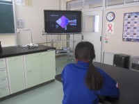 3年生は、英語で「物の形の言い方」について学習していました。最初に、担任とALTの先生が「What do you want?(何がほしい?)」「Blue diamond(青いダイヤ)」などとやりとりするのを聞いて何がほしいのかを聞き取り、タブレット上にその色と形をした図形を表示させていました。「square(正方形)」や「rectangle(長方形)」などの難しい単語もしっかり聞き取っていて感心しました。その後は、子供たちも会話に加わり、互いにやりとりを重ねながら、楽しそうに「物の形や色の言い方」の習熟を図っていました。