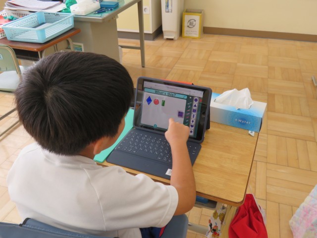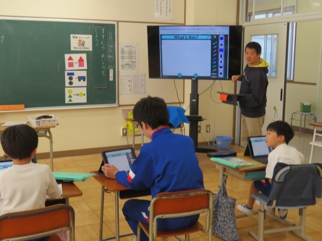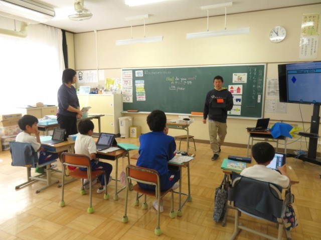 3年生は、英語で「物の形の言い方」について学習していました。最初に、担任とALTの先生が「What do you want?(何がほしい?)」「Blue diamond(青いダイヤ)」などとやりとりするのを聞いて何がほしいのかを聞き取り、タブレット上にその色と形をした図形を表示させていました。「square(正方形)」や「rectangle(長方形)」などの難しい単語もしっかり聞き取っていて感心しました。その後は、子供たちも会話に加わり、互いにやりとりを重ねながら、楽しそうに「物の形や色の言い方」の習熟を図っていました。