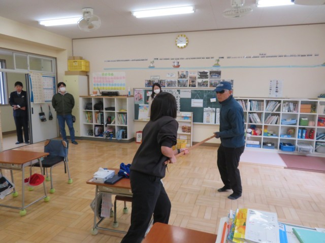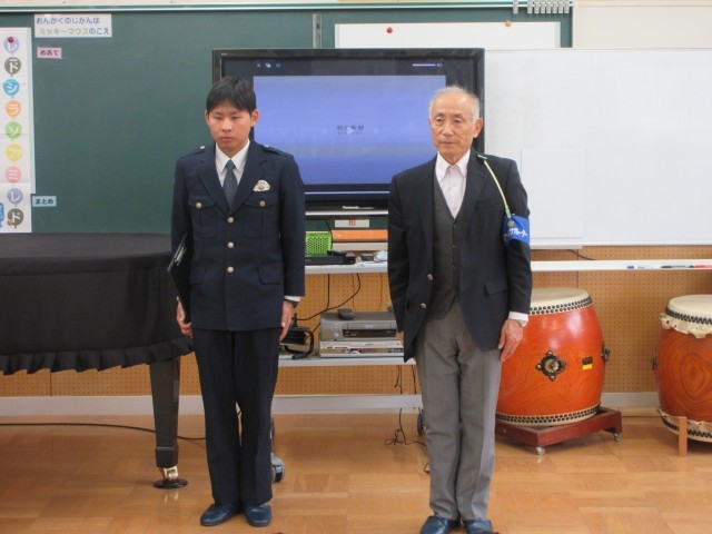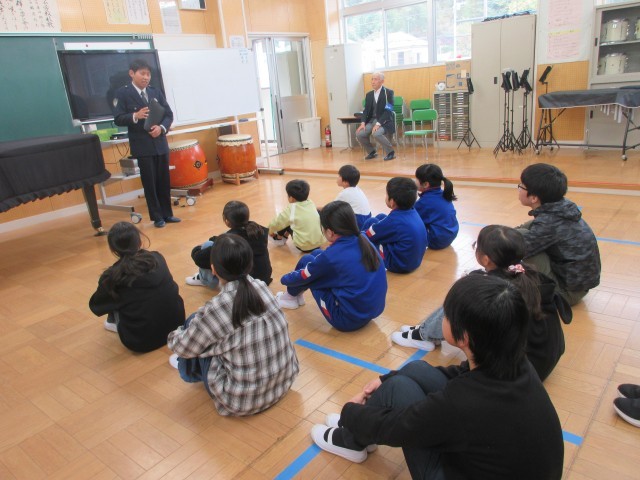 2校時は、日野駐在所の方、スクールサポーターの方をお招きして、校内に不審者が侵入したことを想定した避難訓練を実施しました。子供たちは、HELPカードを活用しながら先生の指示で静かに音楽室に入り、カギをかけて避難することができました(音楽室は非常階段にも通じているので、いざというときはさらにそこからも避難します)。同時に職員は、講師の方の指導のもと、不審者への対応、校内連絡、通報、確保などを実地訓練しました。訓練後には、子供たちに不審者に遭遇したときにどうすればよいかについて指導をしていただきました。また、大阪の小学校での避難訓練の様子をビデオ視聴し、ポイントを確認しました。日野駐在所の方、スクールサポーターの方、お忙しい中ご指導いただき、ありがとうございました。