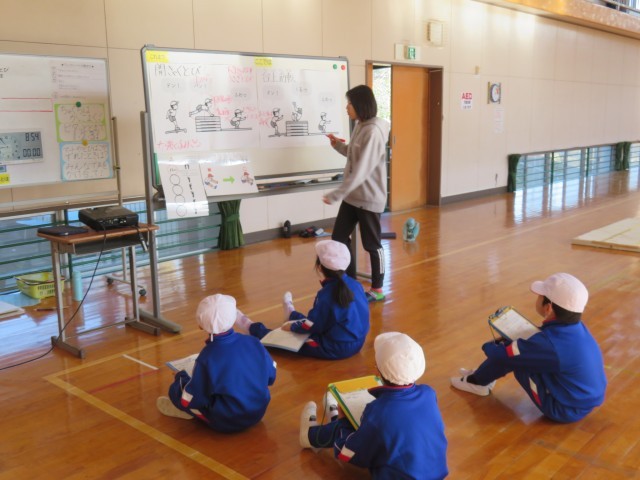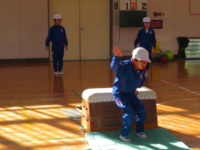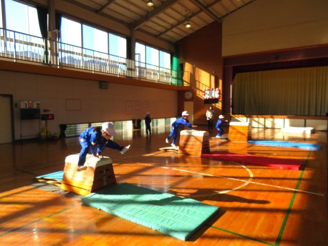 2・3年生は体育で跳び箱の学習をしていました。最初に、サーキット。担当の先生が考えた様々な場で、開脚跳びや台上前転、抱え込み跳びに必要な動きに取り組んでいました。次に、これまでの時間に学習した開脚跳びや台上前転のポイントを振り返ったり、実際にやってみたりしました。開脚跳びや台上前転は、みんなバッチリ!その後、今日の課題である抱え込み跳びに取り組みました。動画で動きのポイントを確認した後、実際に抱え込み跳びに挑戦です。初めて学習する技なので難しく感じたようですが、サーキットでの動きを思い出し、何度も何度もあきらめずに挑戦していました。その姿は立派でした!