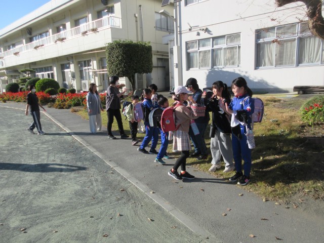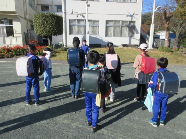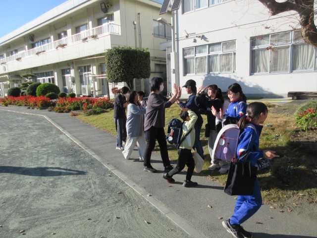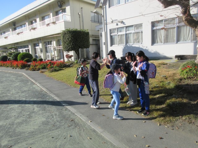 月曜日の放課後はスマイルハイタッチあいさつ運動の日です。今日は鮎川団の子どもたちが並んでハイタッチしながらあいさつを交わして下校します。元気なあいさつと、ハイタッチの「パチン」という音が響いていました。