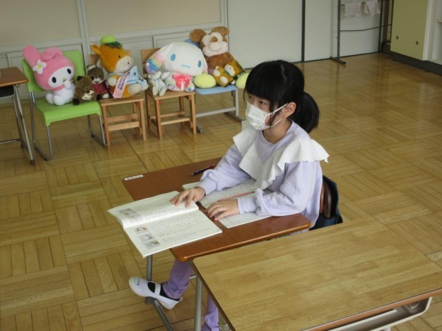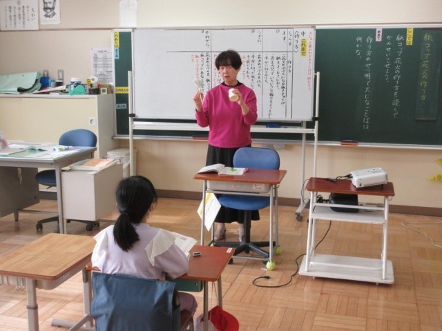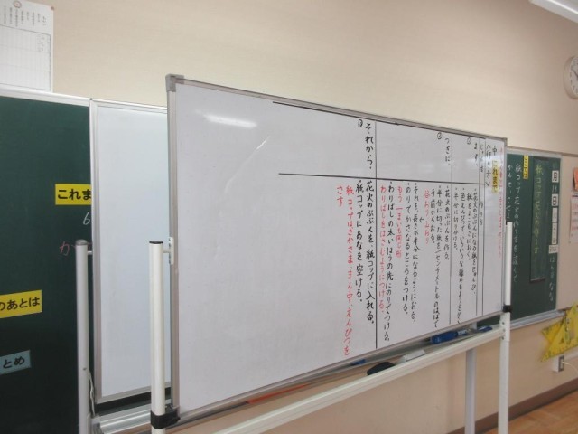 2年生は前回に続いて国語の説明文「紙コップ花火の作り方」の学習をしています。今日は「それから」という接続語について学んでいました。作り方の読み取りでは、鉛筆を使って紙コップの底に穴を開け、割り箸を内側から差し込むところを見つけて、先生に教えていました。授業を進めながら実際に紙コップ花火ができあがっていきます。