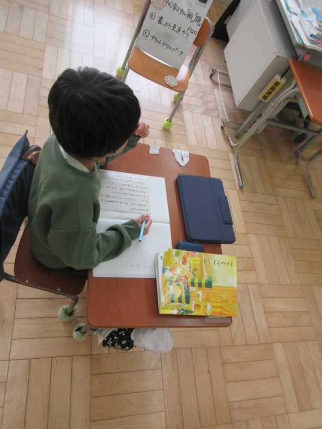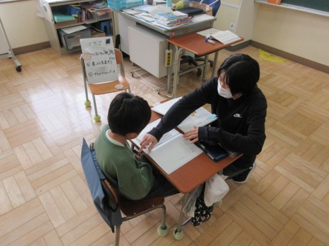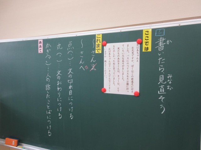 みかぼ学級では2年生が、文章の推敲について学習していました。わざとまちがった作文例を読み取って、間違いを探す学習です。「、と。」「え と へ」など文中にある間違いを次々に探して先生にほめられていました。