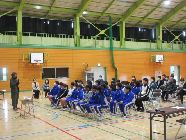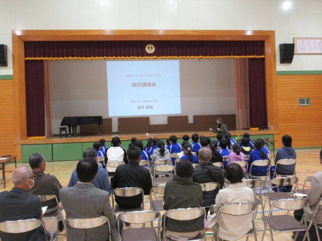 今日の4校時、56年生は平井小学校の6年生と一緒に、防災に関する講演会に参加しました。講師に群馬大学の金井先生をお迎えし、日野地区・平井地区で起こる災害、避難の方法、心構えなどをクイズを交えながら講演してくださいました。講演の中で先生は、「高齢者等避難」「避難指示」が市から出たら迷わず避難すること、「自分から考えて行動する」「他者を思いやる」「みんなで協力する」ことが災害発生時大切なこと、このことは普段の生活でもできるようにしておくこと、などをまとめとしてお話しくださいました。講演会には日野地区の地域づくり協議会の方も参加し、防災への関心の高さをうかがわせました。災害はいつ起こるかわかりません。そのための心構えをしっかりしていきたいと思います。