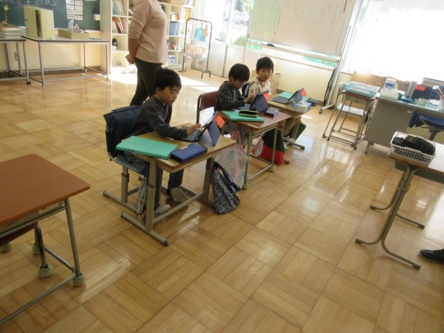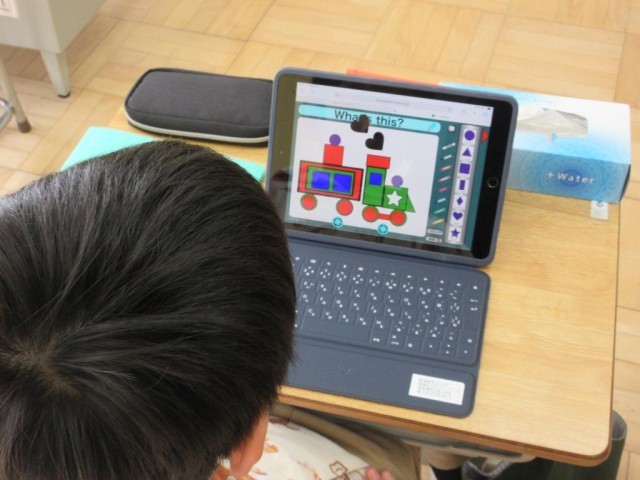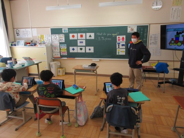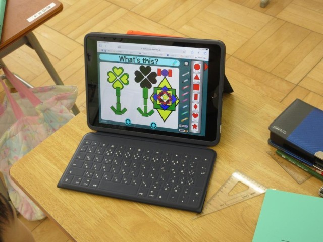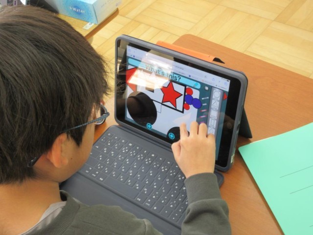 今日はALTの先生が来て英語を教えてくれる日です。3年生は、「色」や「形」を英語で表す学習をしています。タブレットを使っていろいろな形や色を組み合わせてデザイン画をつくりながら、形や色について英語で表す学習をしています。楽しみながら英語を学んでいます。