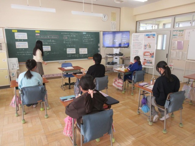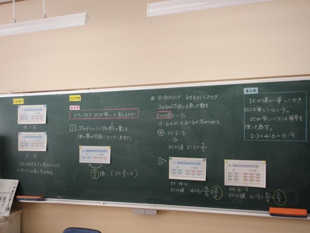 6年生は算数で比が等しいとはどういう意味なのかについて学習しています。ドレッシングの酢と油の量の比を題材に、「味は同じだけど数が違う」ことに着目し、まずは「酢の量が油の量の何倍になっているか」を計算で求めてみると同じ値になりました。このことを「比の値」ということを学んで、比の値が等しいときに比が等しいといえることを確認しました。