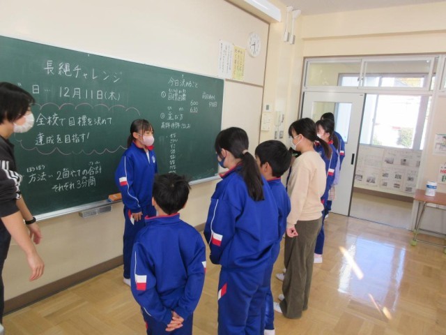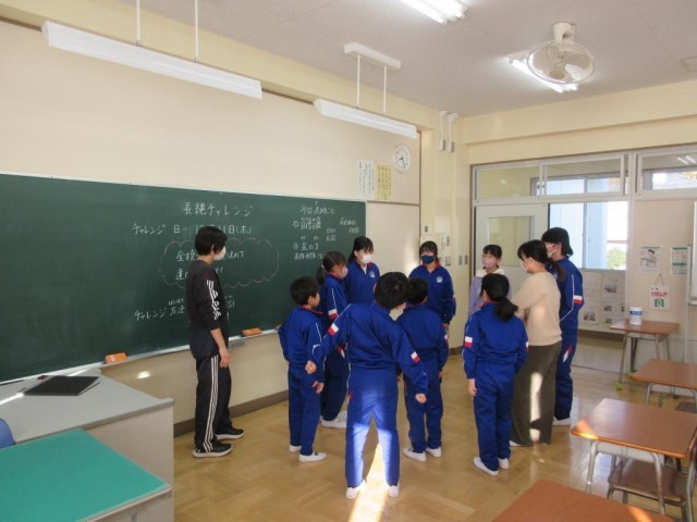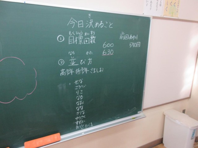 今日の業前は体育集会でした。12月11日に向けて、目標回数を何回にするのか、跳ぶ順番をどうするのかについて、体育委員長を中心に話し合いが行われました。昨年度の最高回数は570回です。これよりがんばって跳ぼうということになり目標を630回に決めました。また、跳ぶ順番は、高学年→低学年→高学年・・・・というふうにごま塩並びで跳ぶことになりました。先生からは、「最後の長縄大会、ぜひみんなが目標を達成する姿が見たい」と励ましの言葉をかけられ、がんばろうという気持ちになっていました。11月25日の20分休みから練習が始まります。子どもたちの頑張りに期待です。