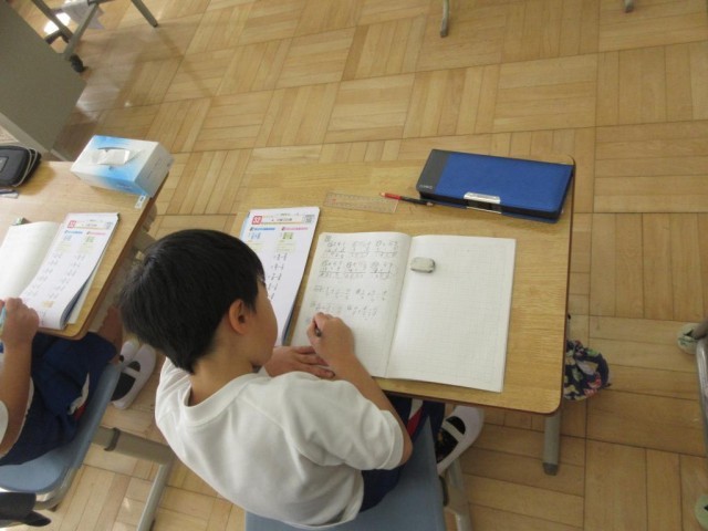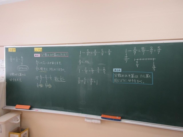 3年生は分数のたし算引き算について学習しています。今日は分母が同じ場合の分数の引き算について、たし算と同じように分子を引けばよいことを学習しました。その後は、分数のたし算引き算の練習問題に取り組みました。