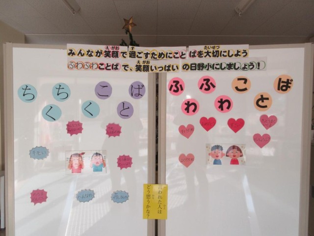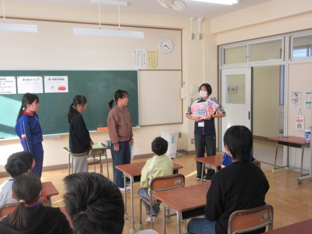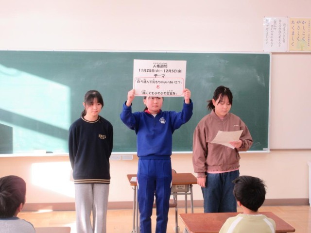 今日の業前は、児童会主催による人権集会が行われました。第二期の人権週間がきのうから始まっていますが、それにあわせての集会です。児童会から、第二期の人権週間では、「あいさつ」「ふわふわことばとチクチクことば」について、目を見てしっかりあいさつすることや、ふわふわ言葉を使っていくことを、具体的に寸劇を交えながら説明してくれました。またその取組の一つとして、玄関に飾った掲示板に言われてうれしかったふわふわ言葉を掲示していく取組をすることが伝えられました。どんな言葉が出てくるのか楽しみです。また振り返りカードの記入や併せて赤い羽根共同募金のお願いも伝えられました。この人権週間を通して、一人一人が相手を大事にするコミュニケーションの一つとして、あいさつや言葉かけを意識して過ごしていきたいと思います。児童会のみなさん、ありがとうございました。