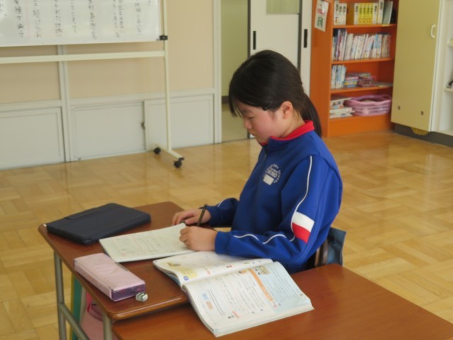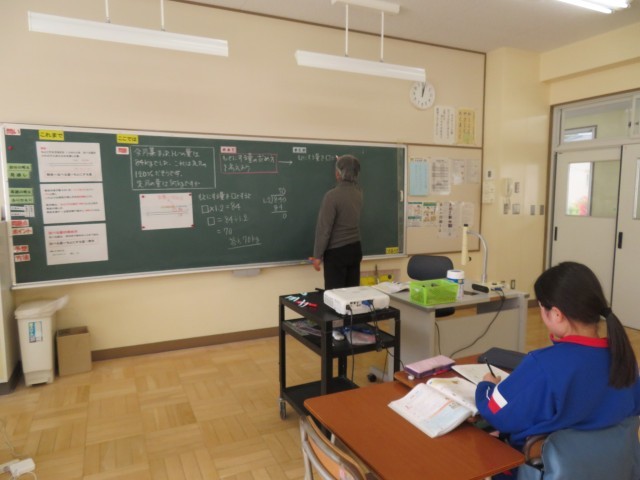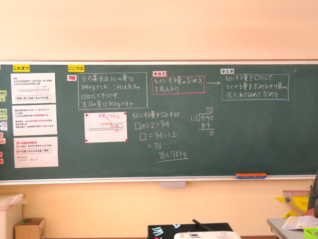 5年生は、算数で「割合」の学習をしています。今日は、これまでに学習した「割合=比べる量÷もとにする量」や「比べる量=もとにする量×割合」という考え方をもとに、もとにする量の求め方を考えていました。問題の状況を数直線で表して確認しながら、どうすれば計算で求められるのかを一生懸命考えていました。「割合」は、子供たちが苦労する学習の一つですが、日常生活の中では買い物や料理など様々な場面で使われる考え方です。頑張ってぜひマスターしてほしいです。