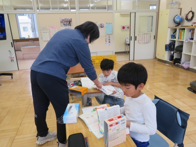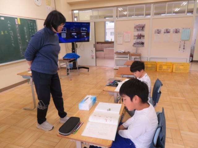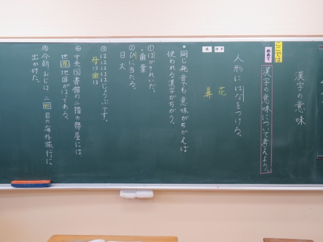 3年生は国語で、同じ発音で意味が異なる言葉(同音異義語)について学習していました。教科書の例題を通して、「花」と「鼻」、「葉」と「歯」など、同じ発音でも意味が違えば使われる漢字も違うということを確認しました。その後、「記者」と「汽車」、どちらの漢字をあてはめると意味が伝わる文章ができるかを考える際には、国語辞典を使って言葉の意味を調べ、きちんと正解の漢字を選択することができていました。日本語には、同音異義語がたくさんあります。文章を書いたり、読んだりする際に、今日学んだことを意識できるとよいなと感じました。