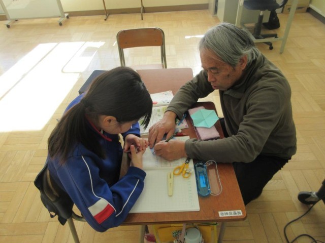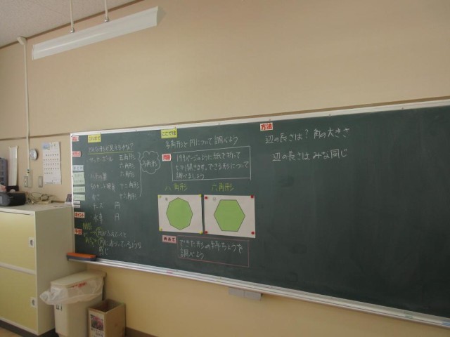 5年生は算数で多角形の特徴について学習しています。今日は折り紙を折って切り取ってつくった正多角形について、辺の長さや、中心角の大きさ、外角の大きさに特徴がないかどうかを確かめています。辺の長さがみな同じであることを測って確かめた後に、角の大きさもきっと同じはずだと予想し、実際に測って調べていました。