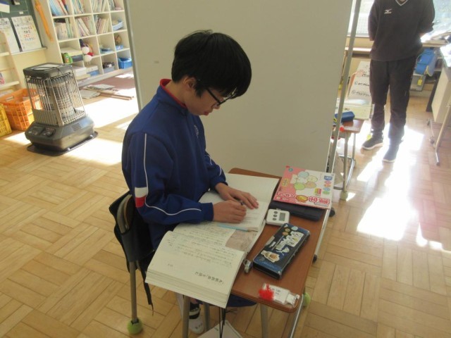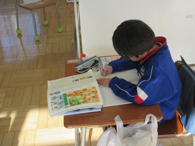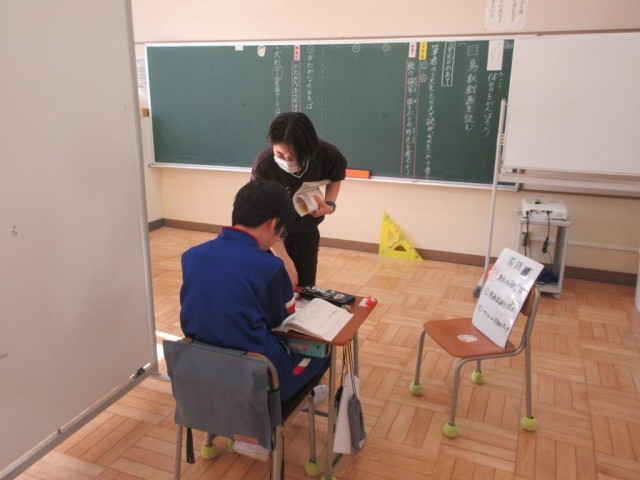 みかぼ学級では国語の授業を進めています。3年生は、カタカナを使って短文をつくる学習に取り組んでいます。教科書で動物たちが遊んでいる様子を短文に表します。3年生は「ぶたさんがシャワーをあびている」という短文をつくっていました。他にもいろいろな短文がつくれそうなのではりきって書いています。6年生は鳥獣戯画の説明文で、今日は鳥獣戯画の絵図をみてどんな特徴があるのかを探しています。